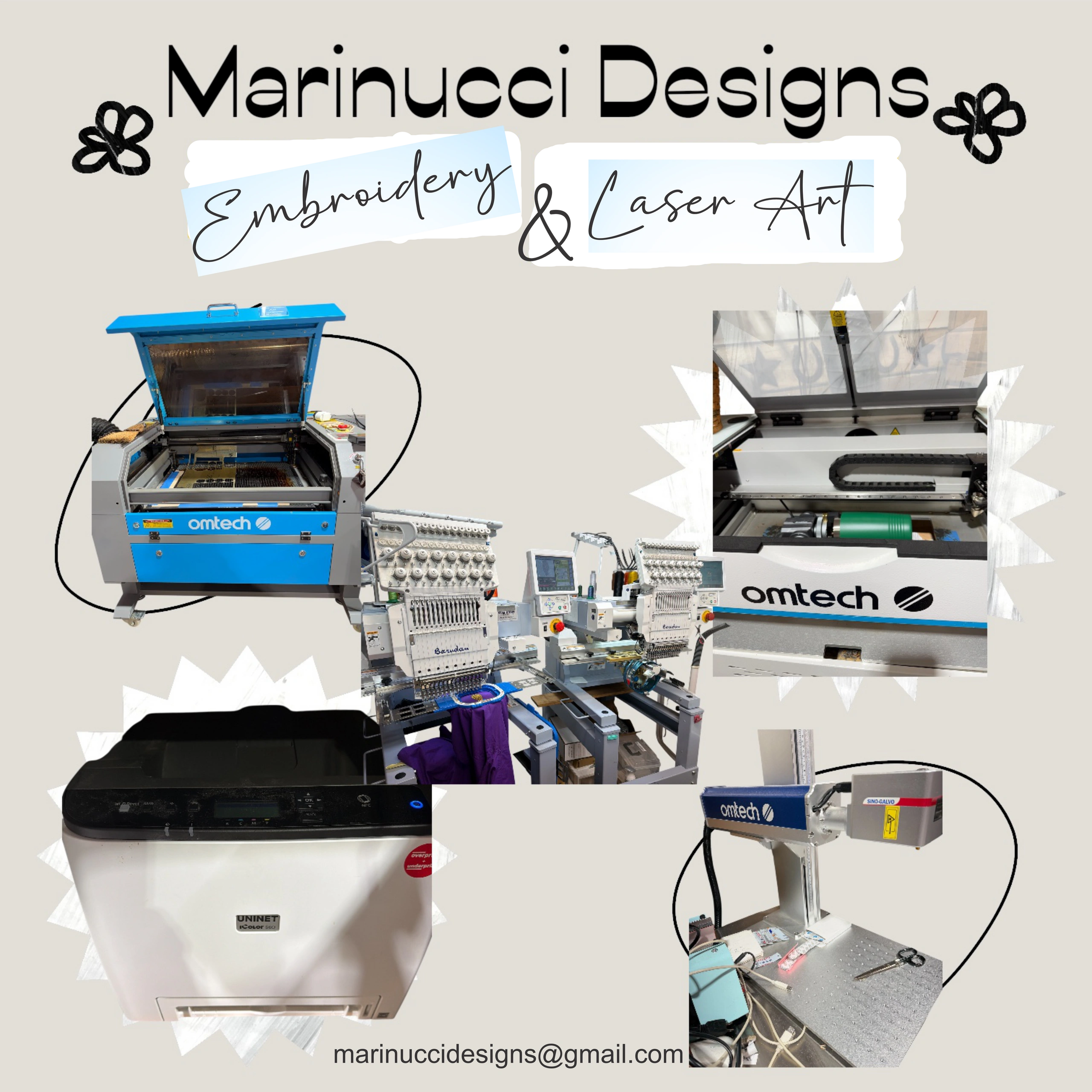 Specializing in CUSTOM embroidery, graphic design, laser art, and printed items.  Marinucci Designs is a small shop located near Harrington, Delaware bringing your logo or design to reality.  With high quality commercial embroidery machines, laser equipment, and printers, we can customize and always hope to exceed your